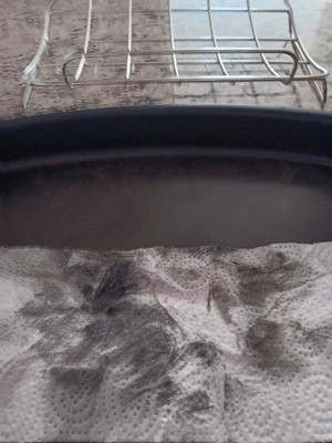 Bought this roasting pan and the first time I used it to bake a ham, it discolored. Yesterday used it a second time to bake an apple crisp and after washing it and drying it with a paper towel all black came off!! Its not a good pan! I have bought many other green pan products including your essential electric skillet and have been pleased with them, but not this purchase.