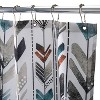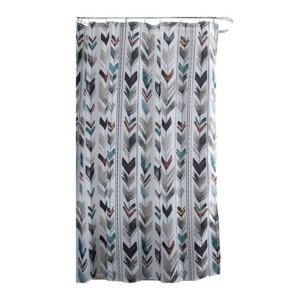 The MESA Fabric Shower Curtain is crafted of 100% Polyester. This shower curtain features a trendy arrow-like pattern printed in fun, on point colors. Why not add a little flair to your bathroom décor! The MESA Polyester Shower Curtain is printed on a white, textured slub, background. Easy Care. This curtain is Machine Washable. Shower Curtain Liner and hooks are required.