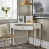 Space-saving Mesa Mid-century Corner Desk by Lifestorey is ideal for any home office area. Designed to maximize space, this corner desk features slender stylish sturdy legs along with a generously sized drawer, perfect for holding all your office essentials. Constructed of durable MDF with tapered solid pine legs and features gold-tone brass leg caps. Finished in a crisp white with a brass drawer pull.