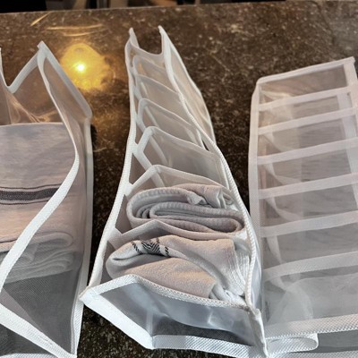 These 4-Pack Mesh Drawer Organizer Inserts from Brightroom™ will effortlessly upgrade your drawer organization. Featuring a white mesh fabric design, these inserts let you easily see what you've stored inside. The pack includes one with an open design and three with divided compartments. Ideal for use on shelves or in cubbies as well as drawers, they're perfect for storing clothing, accessories and more.