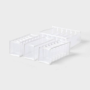 [This review was collected as part of a promotion.] I needed some drawer organizers to help organize my dish clothes and hand towels in the kitchen. I found this set at target and really liked that it had three different sizes and compartment options. I have different sizes of drawers in my kitchen so it is nice to have multiple options to choose from. I did think they felt flimsy at first but I think once you get them full they will mold to be straight. Definitely recommend. I received an incentive to write this review.