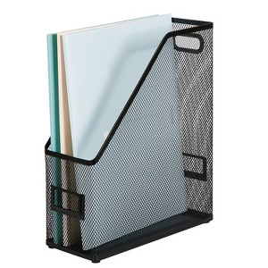 Keep items like magazines, journals, mail, files and more close at hand while keeping your desktop neat and tidy with the Mesh Magazine File Holder from Brightroom™. Made with steel mesh in a sleek black finish, this magazine file holder complements your desktop accessories while helping you keep your loose papers contained and easy to access. Boasting a vertical profile for a space-saving footprint, this magazine holder is also designed with a label holder so you can use multiple organizers next to each other and easily tell what each contains.
