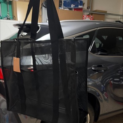 A: Hi SailingBadger - Thank you for your interest in the Mesh Tote Handbag. This unstructured tote handbag has a mesh design to help you see through to the contents inside. It features an open main compartment along with front and side pockets to help keep water bottles and small items separate, and with the double handles, it's easy to carry over your shoulders or in hand. Happy shopping! - Emma