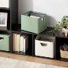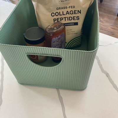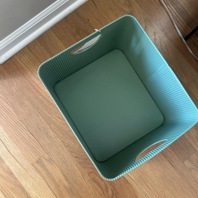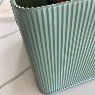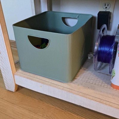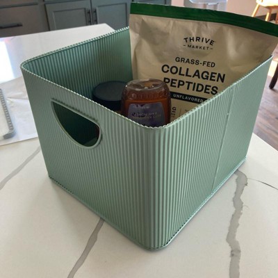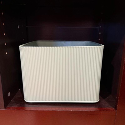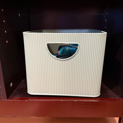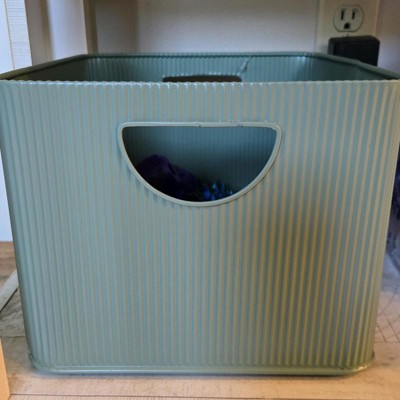 Optimize your space with the help of this Small Metal Bin from Brightroom™. Designed in a square silhouette and featuring a deep design, this small metal bin comes in handy for stashing small everyday essentials such as journals, remote controls, stationery items, craft supplies and more. The open-top design provides easy access to the contents, and the cutout handles make carrying it a breeze. Featuring a ribbed construction in a green hue, it's sure to integrate with different decor styles.