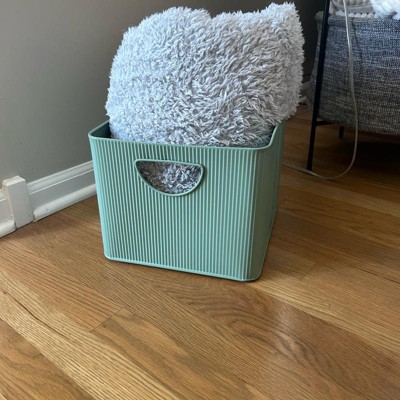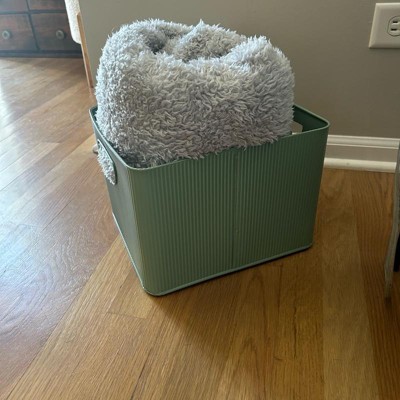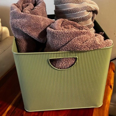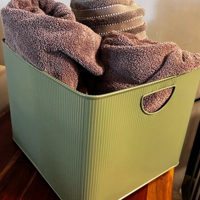 [This review was collected as part of a promotion.] The color of this metal bin by Brightroom is just perfect for any home. I chose this sage green to use in my guest bathroom to hold towels. It will easily hold 4 large bath sheets and or 6-7 regular sized towels. The side open handles make it easy to pick up when full of your goodies! The size is about 12x12 so it will fit easily into any room that you need some extra storage in a very pretty container. I received an incentive to write this review.