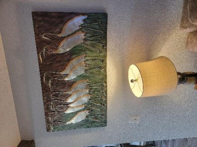 I love this! It is all metal with the heron heads, beaks and feet coming off the background. It’s a statement piece for a wall in my den. I was so hoping it would be nice when I ordered and it has surpassed my hopes. It also came (extremely) well packaged.