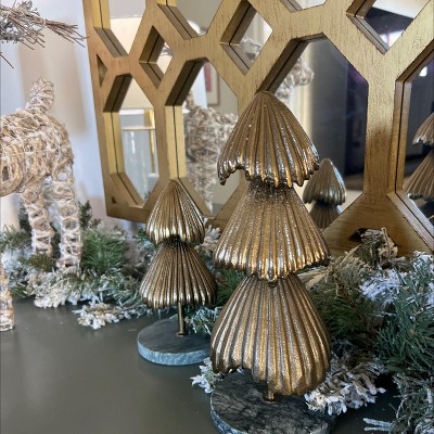 Add a gorgeous touch to your holiday decor with this Metal Christmas Tree with Marble Base from Threshold™ designed with Studio McGee. Crafted from metal, this tree features a layered, scalloped structure with a marble base to add texture and shine to your seasonal setup. Perfect for your tabletop, shelf or mantel, this 10-inch decorative accent piece enhances your home with festive charm.