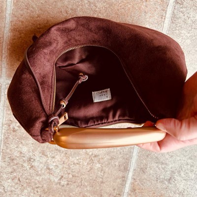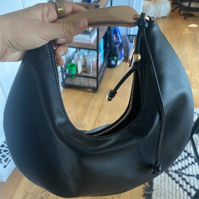 Sport a fashionable look no matter the occasion by carrying the Metal Handle Crescent Handbag from A New Day™. This handbag is designed in the shape of a crescent with a single metal handle for standout appeal. It has a main compartment with an unstructured design, and the zipper closure helps keep the contents neatly contained.