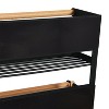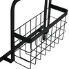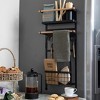 - Black metal magnetic organizer rack with 1 shelf, 2 wooden dowels, 4 hooks, and a wire basket; Supports up to 13 pounds