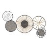 - •This metal abstract wall decor features five circles designed with spirals, a sun-like detail, a woven pattern, and a wheel-like outline