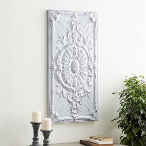 - This white metal wall panel is features embossed scrollwork forming a large flower