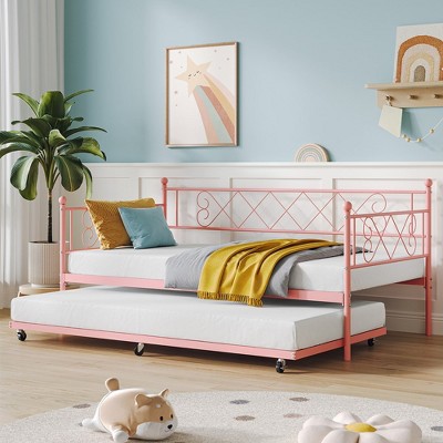 Metal Twin DayBed with Trundle, Sofa Beds with Steel Slat Support and Pull Out Bed, Space-Saving, for Apartment, Living Room, Small Spaces, Purple