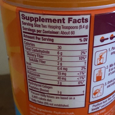 - 2-in-1 formula with psyllium fiber for digestive health and collagen peptides for skin support.