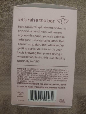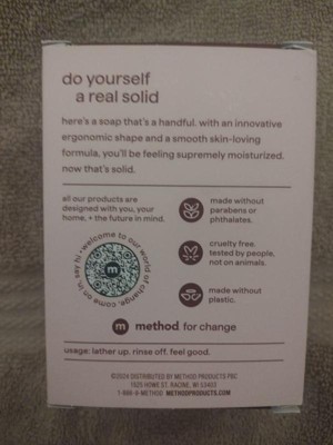 [This review was collected as part of a promotion.] This soap by Method smells amazing, lathers really well and leaves my skin super moisturized! I absolutely love it! The bar is contoured to fit easily in your hand to prevent slipping too which is a great added bonus. I would absolutely purchase this product myself after trying this sample!
