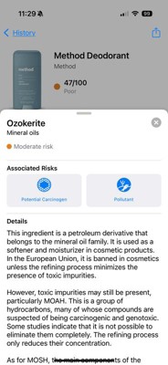 what's in it: caprylic/capric triglyceride*, tapioca starch*, ozokerite, magnesium hydroxide, ricinus communis (castor) seed oil*, cocos nucifera (coconut) oil*, butyrospermum parkii (shea) butter*, fragrance (parfum), zinc ricinoleate, tocopherol, helianthus annuus (sunflower) seed oil*. * denotes plant or mineral origin.
