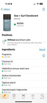 [This review was collected as part of a promotion.] The ingredients are pretty clean and the scent reminds me of the ocean at the beach. The effectiveness is great when applied the deodorant lasted for two days.. I applied the deodorant normally and the scent lasted for two days. Overall 10/10