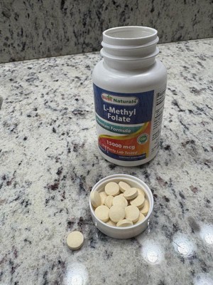 Best Naturals Methyl Folate provides 15,000 mcg (15 mg) of folate per tablet in its methylated form, designed for enhanced absorption and activity in the body. This supplement comes in a 60-tablet bottle, offering a two-month supply at one tablet per day. Methyl folate is the biologically active form of folate, often chosen by individuals with folate metabolism concerns. The product is manufactured in the USA in a GMP-certified and FDA-registered facility and undergoes third-party testing to ensure purity and quality. It is formulated without GMOs, artificial ingredients, or common allergens.