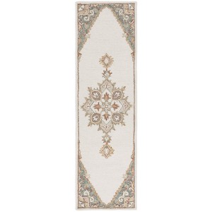 Elevate your interior with our exquisite runner rug, measuring 2 ft 3 in by 8 ft. This hand-tufted masterpiece from India blends tradition and craftsmanship, featuring an oriental pattern in soothing ivory and grey hues. Made with 80 percent wool and 20 percent cotton, this rug introduces a warm and inviting touch to any hallway or narrow space. The half inch height adds a subtle layer of comfort underfoot, while the elegant design brings a timeless charm. Enhance your home decor with a piece that combines artistry and functionality, perfect for those who appreciate the beauty of traditional style.