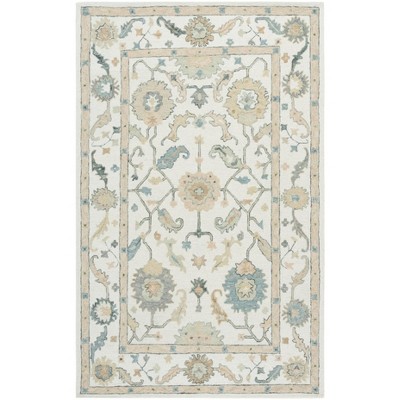 Elevate your living space with our sublime hand tufted wool area rug, a true embodiment of sophisticated craftsmanship from India. Sized at a versatile 5 feet by 8 feet, this medium rectangle rug fits beautifully into a range of room settings. The design flourishes with a rich traditional style, showcasing intricate floral patterns and ornate border detailing in a harmonious palette of beige and ivory, imbuing your home with a sense of elegance and warmth.