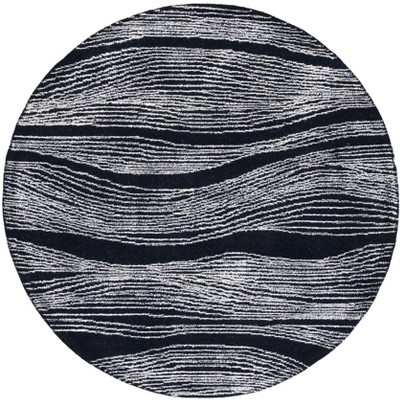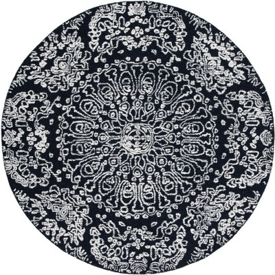 The rug showcases an elegant pattern in striking black and ivory, radiating a sense of timeless sophistication and charm that complements any decor. The round shape brings a unique twist to conventional spaces and will soften the look of angular rooms, making this rug a versatile choice for your home.