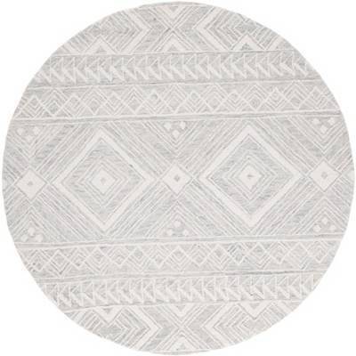 Elevate your living space with our Hand Tufted Wool and Cotton Area Rug, a harmonious blend of comfort and style. Crafted with meticulous care in India, this round 6' x 6' rug, with a plush 3/8" pile height, features an intricate geometric pattern in soothing tones of grey and ivory. The rug's design showcases a series of diamond motifs and dynamic linear elements that create a sense of movement and sophistication.