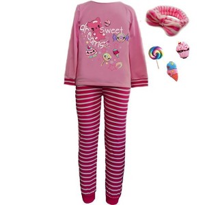 The sweetest pajama set is here. 3D candy and sweets graphic pajama top is interractive. 3 interchangeable candy and sweet treat hair accessories come with this adorable set. All accessories attach to the target spot on the top and in hair. Striped pajama pants match perfectly with the stripe sleeve