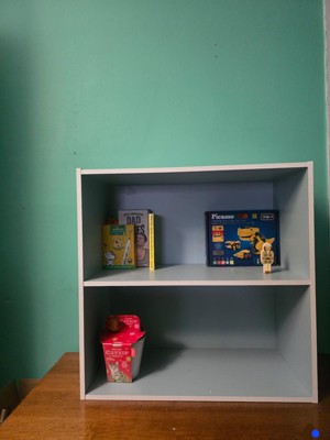 The book shelf is easy to put together. Light blue color, just like the pictures shown. I need more shelf/space to better organize the room and this stackable shelf easily fit in.