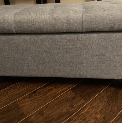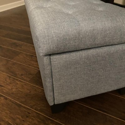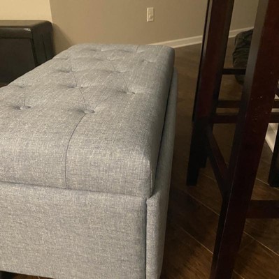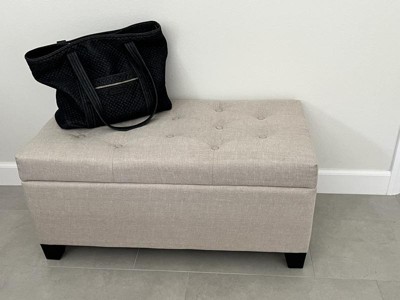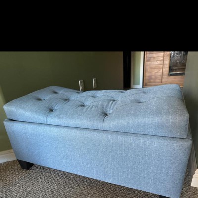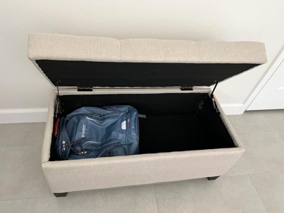 This ottoman offers a stylish design and functional storage, making it a great addition to any room. Guests appreciate its aesthetic appeal and the convenience of the storage feature. However, assembly can be challenging due to the lack of pre-drilled holes and the quality of materials, particularly the hinges and fabric, which have been noted as concerns. Despite these issues, many find it a valuable piece for its price.