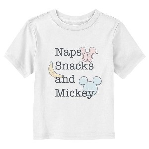 • The smallest family members are also the most stylish with this new toddlers' t-shirt that is perfect for every occasion! Featuringthe text: "Naps Snacks and Mickey," with the classic Mickey logo, an alarm clock, and a banana colored in pastel colors across the front.