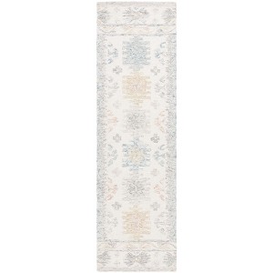 Introducing a beautiful touch of tradition to your space with this hand-tufted runner rug. Measuring 2 feet 3 inches by 8 feet, this ivory and blue masterpiece embraces timeless design with its traditional style. Crafted from a blend of 80 percent wool and 20 percent cotton, this Indian-made rug adds a soft and inviting texture to any room. The runner shape and 1/4 inch height make it perfect for hallways or narrow spaces, providing a comfortable and stylish path for your home. The charming blend of colors complements a variety of decor themes, offering versatility and elegance. Bring a sense of warmth and comfort to your home with this exquisite addition.
