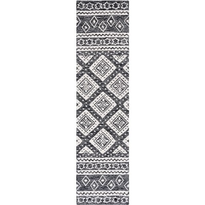 Transform your living space with this exquisite 6'0" x 9'0" area rug, expertly hand tufted in India. Crafted from a rich blend of wool and cotton with latex, this rug offers both comfort and durability. Its geometric pattern, set in a stylish black and grey palette, enhances any room with a touch of sophistication. The medium rectangle shape and quarter-inch height make it an ideal addition to a variety of spaces, whether placed under a coffee table or as a standalone piece. This rug embodies the bohemian style, adding an element of artistic flair to your home decor. Elevate your interior with this versatile masterpiece, where tradition meets contemporary design.
