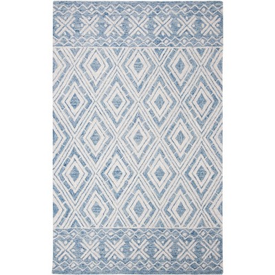 Introducing our stunning area rug, a masterpiece of craftsmanship and design. Measuring 5 feet by 8 feet, this medium rectangle rug features an elegant blue and ivory palette, perfect for adding a touch of sophistication to any room. Hand tufted in India, it combines wool and cotton with a touch of latex, providing a comfortable yet durable surface. The bohemian style and geometric pattern lend a captivating visual interest, making it a standout piece for any decor. With a height of just 1/4 inch, it sits beautifully in any space, offering a blend of texture and style. Transform your living area with this exquisite rug.