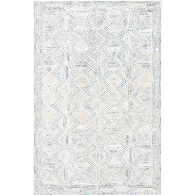 Elevate your space with this stunning hand-tufted rug from India, perfectly sized at 3 feet by 5 feet. Featuring a striking geometric pattern, it beautifully blends blue and ivory tones, adding a touch of bohemian flair to any room. Crafted with a combination of wool and cotton and backed with latex, this rug offers both style and comfort with its 1/4 inch height. Whether you're refreshing a living area or enhancing a cozy reading nook, its small rectangular shape fits seamlessly into various settings. Embrace the artistic allure and intricate craftsmanship of this piece, making it a delightful addition to your decor. Transform your space into a haven of creativity and comfort.