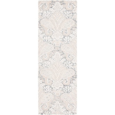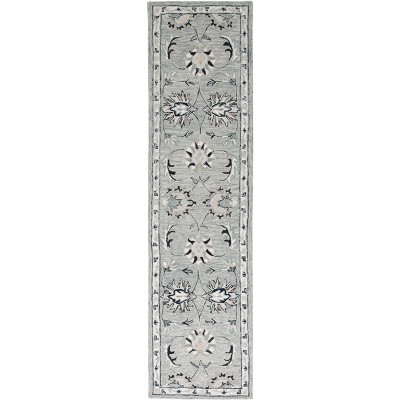 Introduce an elegant touch to your home with this stunning runner rug. Sized at 2 feet 3 inches by 9 feet, its grey and ivory hues blend seamlessly with various decor styles. Featuring a traditional floral pattern, this hand tufted rug from India brings sophistication to any hallway or room. Crafted from wool and cotton with latex, the rug stands at a convenient height of one quarter inch, offering comfort and style. Its delicate weaving technique showcases intricate detailing, reflecting timeless artistry. The runner shape is ideal for elongating spaces, providing a pathway of design that enhances the beauty of your home. Transform your space with this exquisite piece that embodies a perfect blend of form and function.