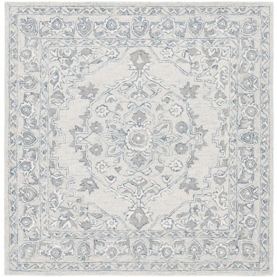 Elevate the elegance of your living space with our exquisite hand tufted area rug. Measuring 5 feet by 5 feet, this square masterpiece effortlessly combines function and beauty. Crafted from a harmonious blend of wool and cotton with latex, it offers a soft and inviting surface. The rug showcases a delicate ivory and blue color palette, perfect for complementing a range of interiors.