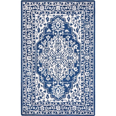 Introducing our contemporary navy and ivory area rug, a stylish centerpiece crafted to enhance your living space. Measuring 5 feet by 8 feet, this medium rectangle rug offers the perfect size to define comfort in any room. Made in India, the hand-tufted technique and blend of wool and cotton materials exude an inviting warmth and texture. The 3/8 inch height provides a satisfying feel underfoot while maintaining a sleek profile. With no pattern to distract the eye, the elegant color combination captures attention and complements various decor styles. Elevate your home aesthetics with this chic and versatile rug.