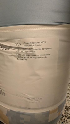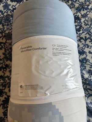This reversible microfiber comforter from room essentials is nice and soft. I like the puffy thickness it adds to the bed top and the fact that I can flip it to change up the colors in the room a bit. I just am a bit put off by the washing instructions. It says it is machine washable, but on the back says to use a large capacity commercial washer and dryer. I am not going to take it to a laundromat if that's what its suggesting. I see that the cover is made with 100 percent recycled polyester. That is actually kind of good to see in my opinion. All in all, this full/queen comforter is a great addition to our bedroom.