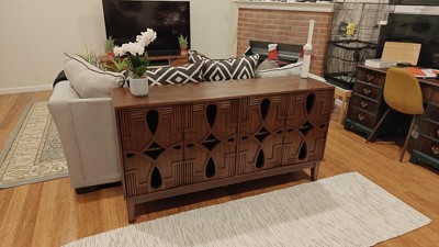 Mid Century Modern Accent Cabinet with 4 Hollow Carved Doors and Outlet Holes, Sideboard Buffet Cabinet with Storage Shelves for Kitchen, Living Room