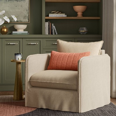 Mid Century Modern Accent Chair, Comfy Living Room Chairs with Sturdy Wood Legs, Rattan Backrest & Beige Thick Linen Cushion