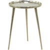 - •Round metal end table features a circular tray tabletop with a raised grooved edge and pointed cone-shaped tripod legs