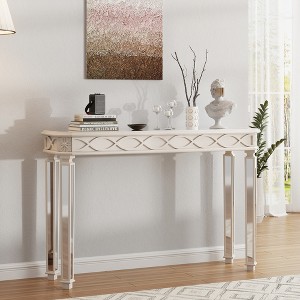 Enhance your home with this mid-century modern console table that blends solid wood stability with eye-catching mirrored accents. Its unique octagonal tabletop and elegantly carved details create a artistic centerpiece, while the reflective surfaces help brighten your space by adding visual depth and a touch of luxury. Perfect for entryways, living rooms, or as a sofa-side table, it offers both style and functionality—whether displaying decor, storing essentials, or accenting your layout. Easy to clean and assemble, this table brings lasting beauty and practical design to any interior.