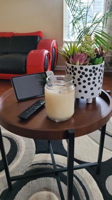 There is a lot I really like about this table. I love a table with a removable tray top - it functions beyond looking good which is such a bonus in a small space. I love the warmth that the wood top brings to my space and the open bottom makes it take up less visual space while still making a statement. I was expecting the wood top to look a bit more natural, but it looks very finished which makes it feel more manufactured than I usually prefer. When I was putting it together, the plastic end caps seemed cheap, but now that I’ve lived with it a bit, I realized that my eye can’t tell that it’s not metal. It looks good and is very functional in a small living room which overall makes it a good buy.