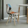 - COMPOSITION: The chair seat and backrest are molded with solid polypropylene (PP) plastic, a sturdy recyclable material, and covered with colorful multipattern patchwork upholstery. The Eiffel style legs are made with solid beech wood in a natural wood color, showcasing its beautiful wooden grain.