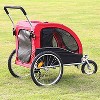 Can be used as a push stroller or a bike trailer. To lock/unlock the front wheel the pin pulls out and twists. Easy way to transport and include your dog that may be too young, old, or injured to keep up with you and your daily activities, but still want to include them! Fabric screen windows provide lots of ventilation. Reflector allow for safer night time riding. Includes a hand brake. 50" x 29" x 40.5". Weight limit- 80lbs