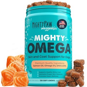 Mighty Paw Waggables Mighty Omega is a veterinarian-formulated fish oil supplement made in the USA to help your dog shine from the inside out. Packed with skin-loving Omega-3s, EPA, and DHA from salmon oil, these bacon-flavored soft chews support a healthy, shiny coat while soothing dry or itchy skin.Easy to give and delicious to eat, Mighty Omega promotes overall wellness and helps your pup look and feel their best. Perfect for dogs of all ages and sizes.Always store supplements in a cool, dry place and supervise your pet during use.Crafted to nourish your dogs health and happiness, because every dog deserves the best.By dog lovers. For dog lovers.
