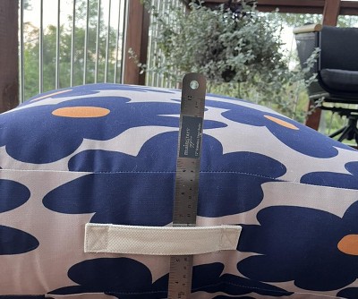 The cushion is well made with good stitching, & sturdy fabric & handle. The blue is lighter than the rich deep navy pictured. I gave it 3 stars mainly because it came puffed out to about twice the size as described, without the crisp square edges as shown. I may send it back if it doesn’t flatten after it sits level a while.