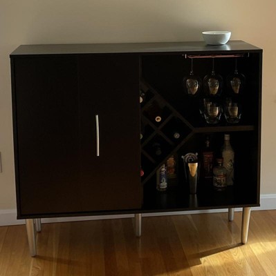 The contemporary Miko Black Wine Cabinet by Homes: Inside + Out offers a sleek server featuring sleek and smooth bifold cabinet doors and modern metallic accents. The eye catching diamond shape of the center wine rack of this buffet brings drama and geometric flair. The wine rack also delivers storage space for nine wine bottles showcasing your favorite vintages. Angled, tapered legs in a warm finish add a touch of mid-century flair sure to enliven your dining room.