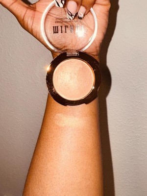 [This review was collected as part of a promotion.] Kinda disappointed in this highlight from Milani, it’s dusty when applied and barely shows up. I swatched very generously in the picture and that’s all I got. What does show up is more of a shimmer than glitter. Guess it would be ok if you like a very subtle glow. Have to give it a star for not breaking in shipping though.