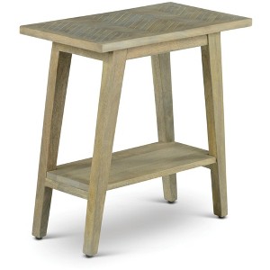 Solid wood herringbone pattern inlaid topConstructed of mango solids and engineered woodsStyling details mid-century modern canted legs, bottom shelf for display or storage and chevron patterned topBottom shelf for display or storageAn assortment of tables to fit environments perfectlyNatural Finish