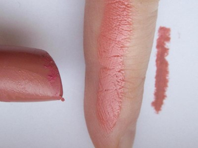 This was a massive disappointment and waste of money. I wanted a neutral, cool-toned light pink, and that's what the so-called swatch in the base of the case shows -- but the actual lipstick has unpleasant warm, orange-y brown undertones that make it unwearable for me -- a hideous color on me. I uploaded two pics: One shows the lipstick swatched on white paper next to the color shown at the base of the case; the other shows the lipstick itself, a swatch on my finger, and the swatch on white paper.